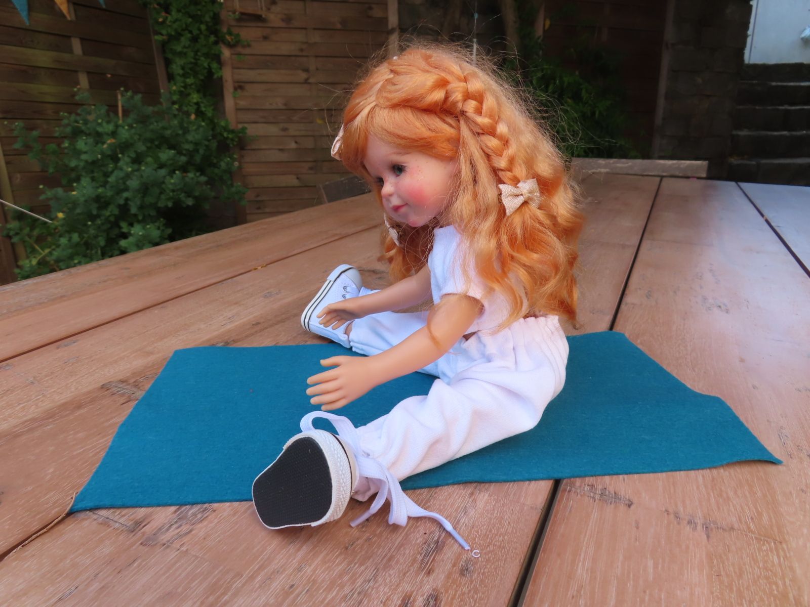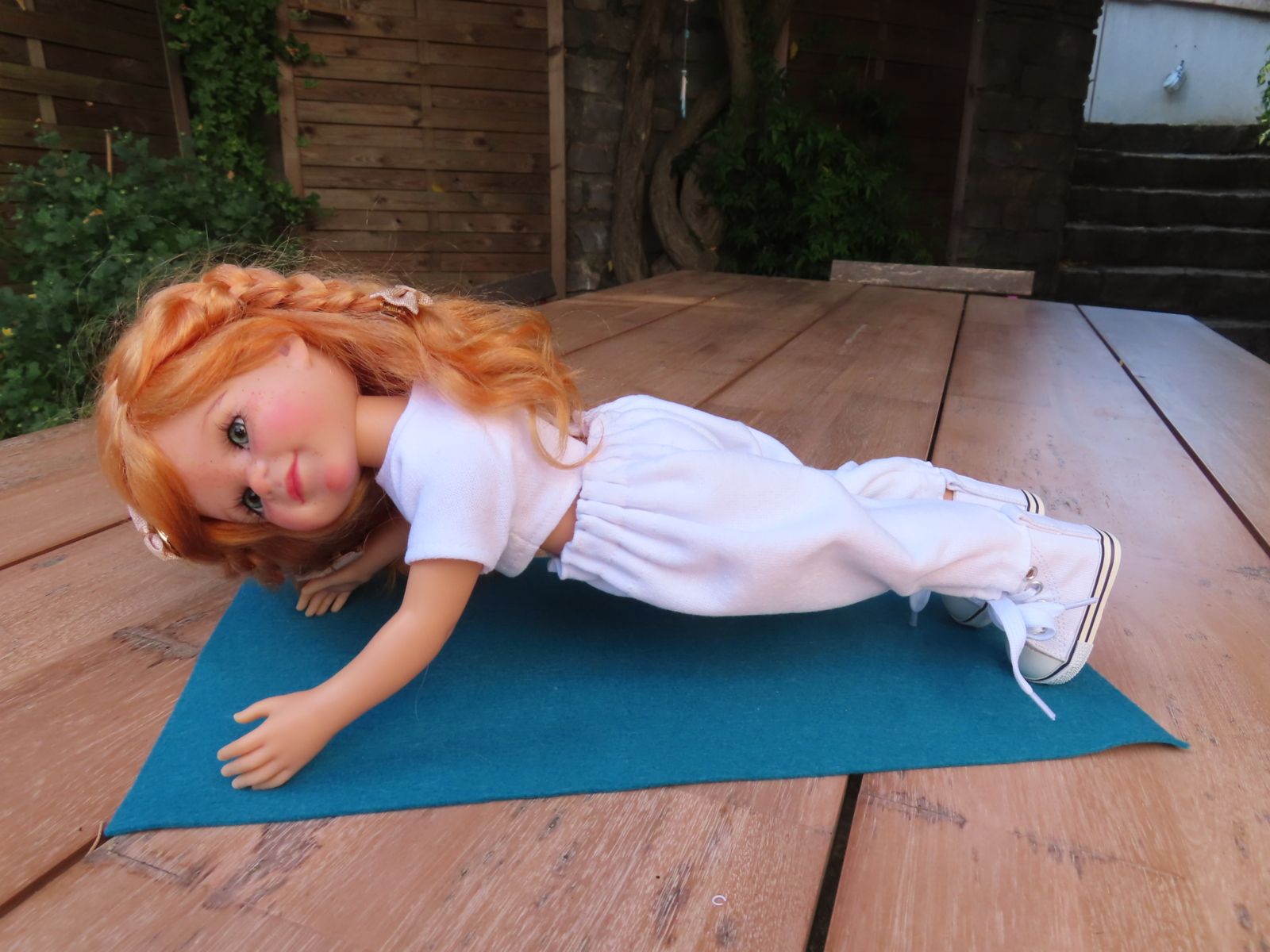 Elle a pris son tapis de sol pour réaliser les exercices et enfilé la tenue adéquate : un pantalon de sport en jersey blanc et un petit top assorti (cousue, encore une fois, avec un patron de Yummi).